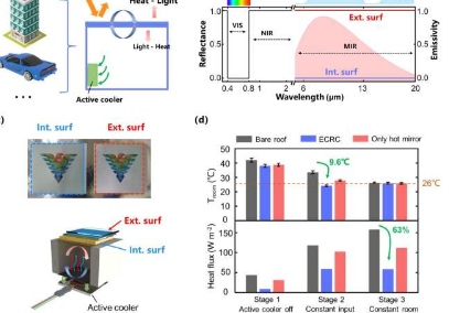 在发表于LightScience&Application的一篇新论文中,由浙江大学李强教授和中国西湖大学邱敏教授领导的一组科学家及其同事提出了一种光子工程热管理策略,该策略包含将增强的保色辐射冷却(ECRC)系统集成到现有的主动温度调节外壳中。通过高效的能源调节,可实现高达63%的能源消耗节电。