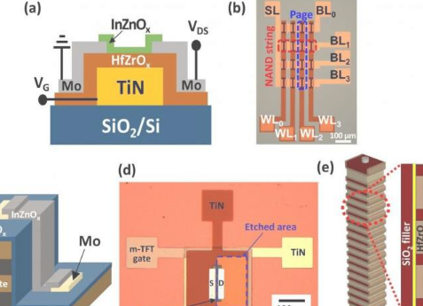 研究团队通过使用基于氧化f的铁电体和氧化物半导体解决了这些问题。新的材料和结构确保低功耗高速 通过使用氧化物半导体作为沟道材料来降低工艺温度并抑制不需要的界面层的形成,从而实现了高稳定性。结果,研究人员证实,所制造的器件可以以比传统闪存低四倍的电压工作,并且速度要快几百倍,并且即使重复使用超过一亿次也可以保持稳定。特别地,通过原子层沉积来堆叠铁电材料和氧化物半导体,以确保适合于制造3-D器件的处理技术。该团队提出,高性能器件可以在400°C下以比传统闪存器件更简单的工艺来制造。